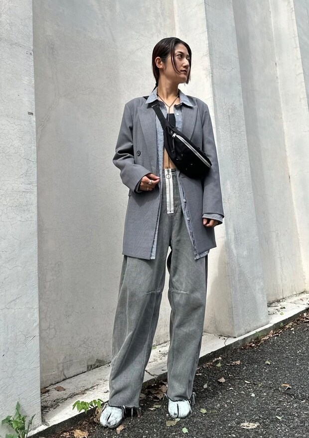 ミースロエのジャケット、ヌルのデニム、ヴィンテージのシャツ、メゾンマルジェラのボディバッグとブーツ、トレスのネックレス、その他は本人私物
