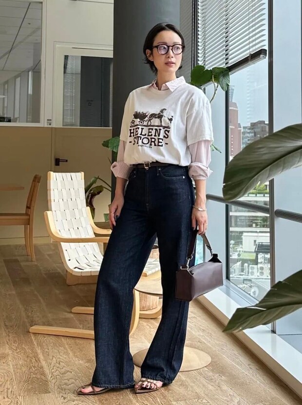 夏に着倒したTシャツも、シャツを重ねれば秋もまだまだ活躍。ポイントは、 キレイめなグラフィックTにストライプシャツを合わせて秋らしくトラッドムードにまとめていること。