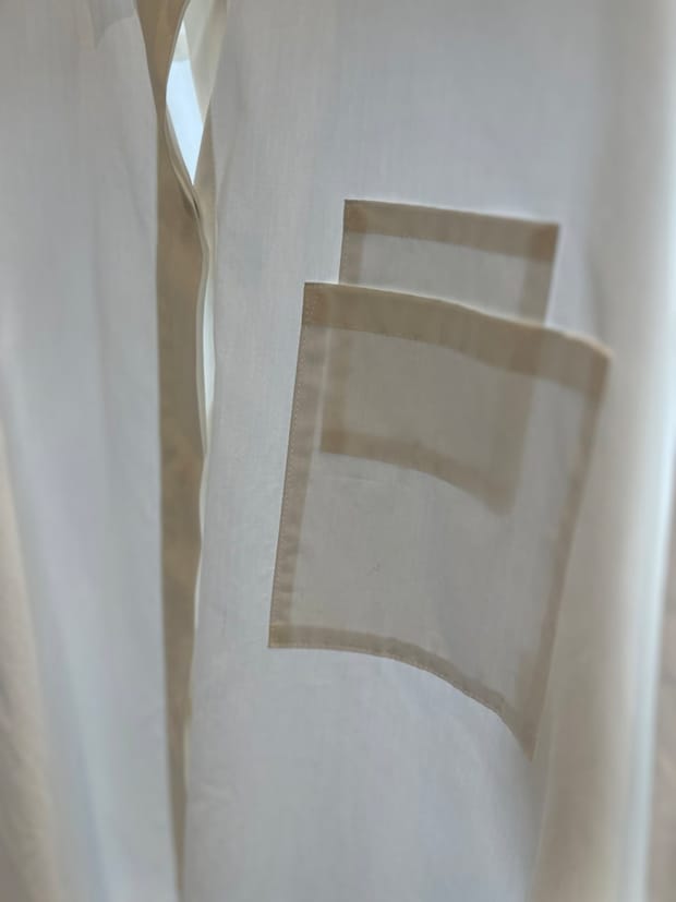 で、【アパルトモン】のシャツを見てみると、まず生地がイイ! なんとイタリアを代表する最高峰シャツ生地メーカー、アルビニ社の生地を使用しているそうなんです。ここの生地は極細のコットン糸で密に織り上げた生地が特徴なんですが、このシャツがまさにそう。すごくしなやかで肌触りもよく、品よく透ける感じも絶妙。ナチュラルなシワ感もあるので、意外と着こなし難易度が高い白無地でも表情があり、こなれた雰囲気を演出できるんです。