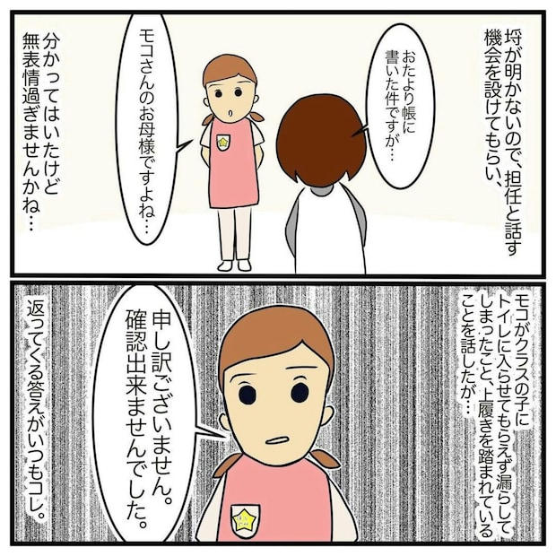 ある日、モコちゃんは同じクラスの女の子2人から、トイレの使用を禁止されたり、上靴を踏まれるなど、陰湿ないじめを受けるようになりました。アサコさんは、お便り帳を通じて担任の若葉先生に注意して見てほしいとお願いしましたが、若葉先生は「確認できませんでした」と繰り返すだけでした。