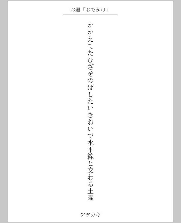 かかえてたひざをのばしたいきおいで水平線と交わる土曜(投稿者/アヲカギさん)