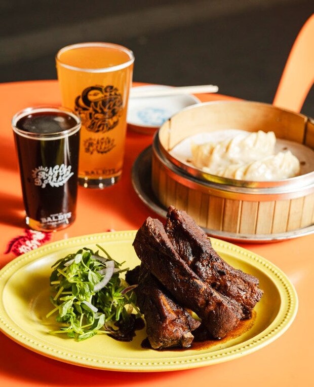 メニュー例/ニンニク不使用のジャンボ餃子450円(2個)、八角香るローストポークバックリブ1,600円、焙煎モルトを使用したBLACK MAMBA900円(ハーフ)、青々とした柑橘のHENRY1,200円(パイント)