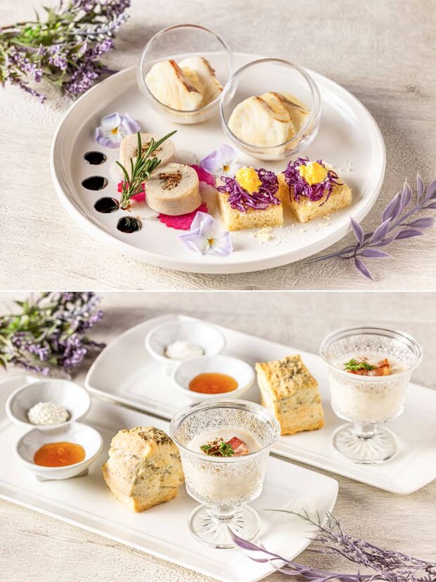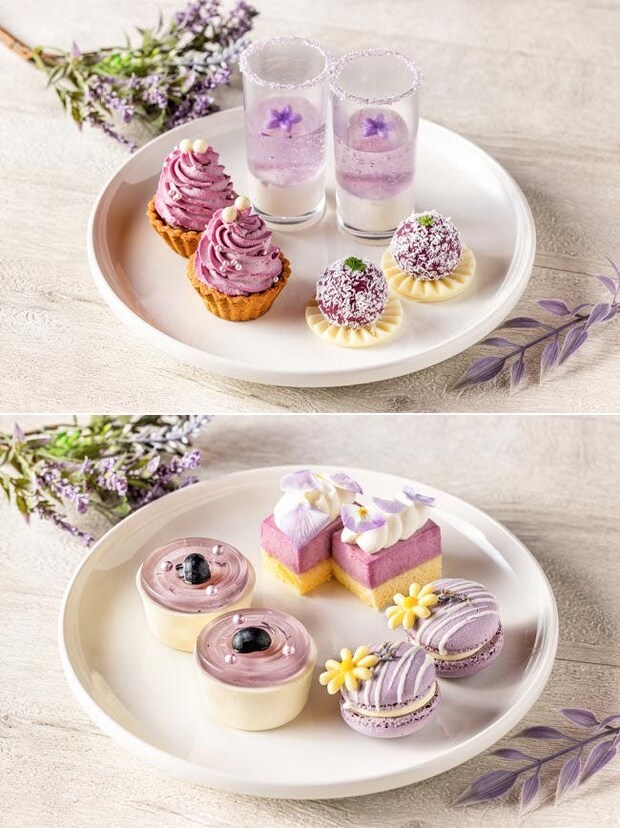スイーツは、色鮮やかな「バラ香るカシスタルト」をはじめ、爽やかな味わいの「スミレジュレ」や、かわいらしい花のモチーフが飾られた「ラベンダークリーム&ブルベリーマカロン」など、心ときめく品々が勢揃い。香りと味わいの繊細なバランスにこだわり抜いた、パティシエ渾身のラインナップを召し上がれ。