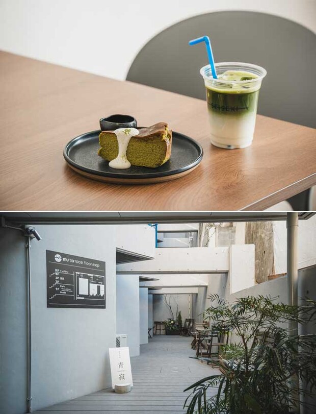 上/八女の抹茶を使った抹茶ラテ650円、同じ素材を用いた抹茶バスクチーズケーキ1,000円。抹茶ソースをかけて味変を 下/マンションの1室にある隠れ家的立地