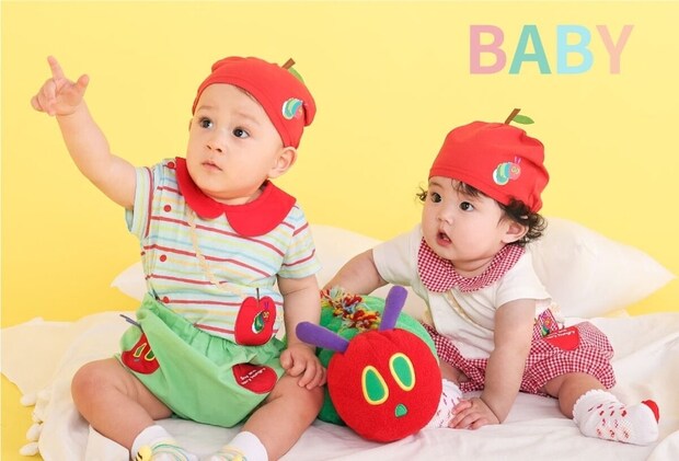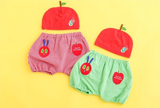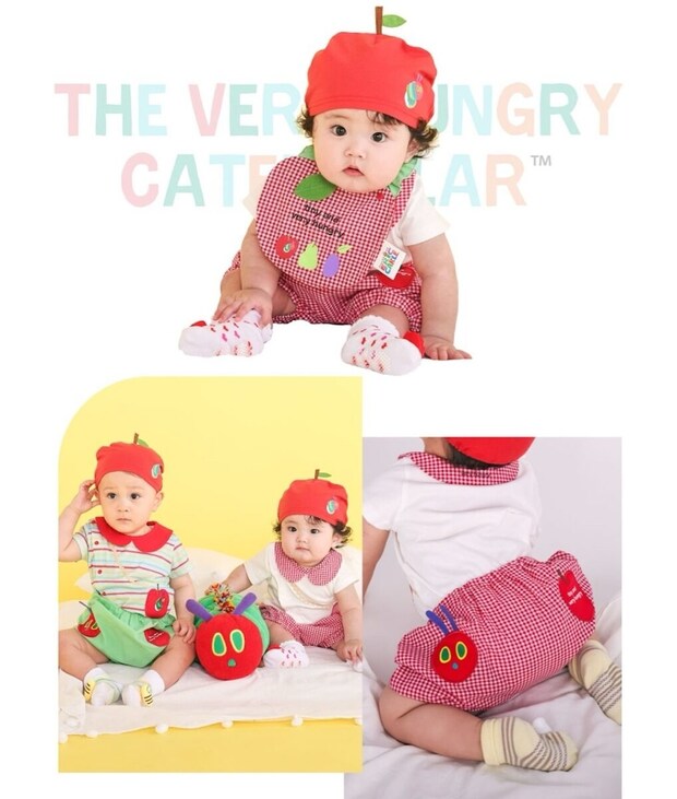りんごバッグ風のパッチが目を引くボディミニと、『はらぺこあおむし』のお顔モチーフに、りんごのパッチをあしらったブルマ&りんご帽子が登場。
