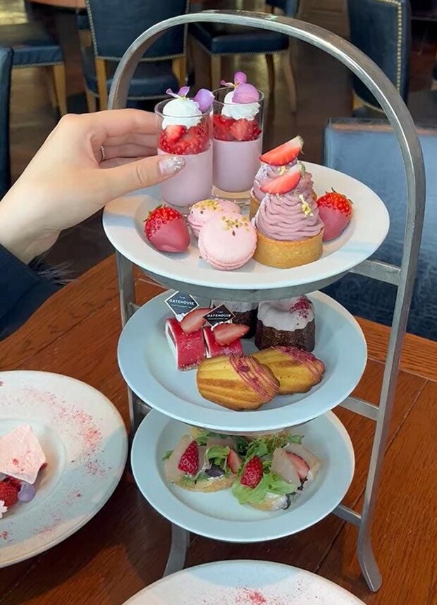 「桜あんといちごのモンブラン」や「いちごのパンナコッタ」、ベリーの香りをまとわせたカヌレ・ボルドーなど、春らしい表情のスイーツがそろう構成。セイボリーには、ほうれん草とベーコンのキッシュ、いちごと生ハムのオープンサンドが添えられ、甘さの合間に塩気が心地よく入ります。