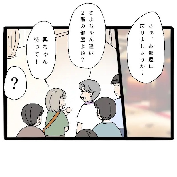 その後、「さぁ、お部屋に戻りましょうか~。さよちゃん達は2階の部屋よね?」義母にそう言われると、「典ちゃん待って!」そう言ってさよさんは義母を引き止めます。「?」義母も周りにいた人もみんなが驚いていました。