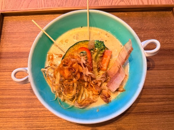 「ぼたんスープカレー 白」は、白味噌とイノシシソーセージを使い、昆布だしによる優しい味わいに仕立てている。
