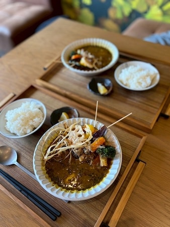 店内では看板メニュー「ぼたんスープカレー」のほか、丹波篠山の特産物であるイノシシ肉や味噌を活かした3種類のカレーを提供する。
