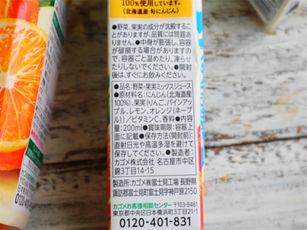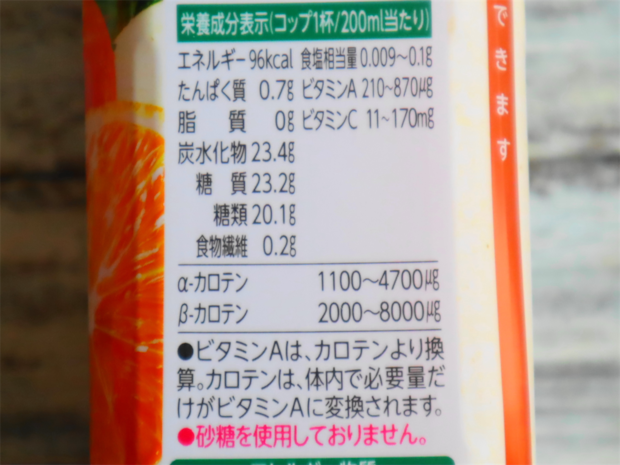 何が配合されているのかチェックしてみたところ、にんじんと果物のみでとってもシンプル。果実はりんご、パインアップル、レモン、ネーブルオレンジと、甘味・酸味・香りがよいものばかり。