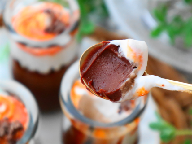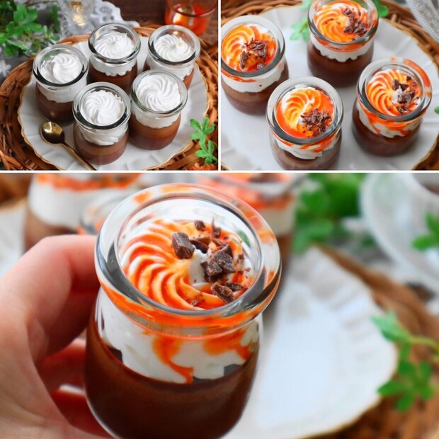 生クリームに砂糖を加えて泡立て、固まったチョコムースにたっぷり絞って、にんじんソースと刻んだチョコをかければ完成です。