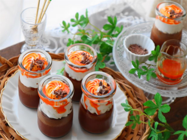 水とチョコレートだけで作る水チョコムースが話題となっていますが、にんじんジュースで作るとどうなるの? と気になって試してみました。ついでに旬にんじんmixを煮詰めたソースをかけて色鮮やかなスイーツに♪