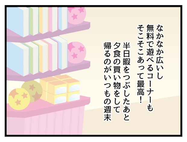 土曜日は娘・まいと近所の大型スーパーのキッズコーナーで時間をつぶしているたまみ。まいのお気に入りは2人乗りの電動遊具で、1席空いているときはいつも一緒に乗ってくるように言っていました。