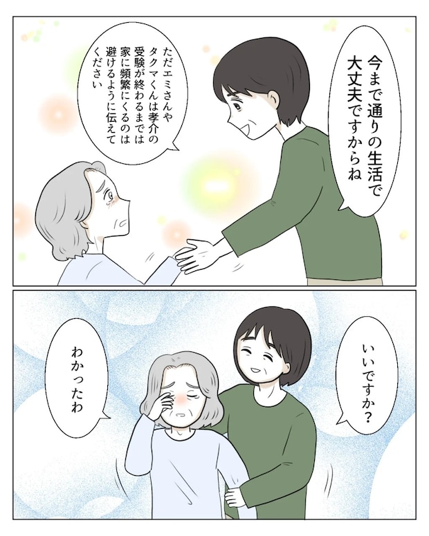 「今まで通りの生活で大丈夫ですからね。ただエミさんやタクマくんは、孝介の受験が終わるまでは家に頻繁に来るのは避けるように伝えてください。いいですか?」義母を支えながらそう話すたか子さんに、「わかったわ」と涙ぐみながら答える義母。