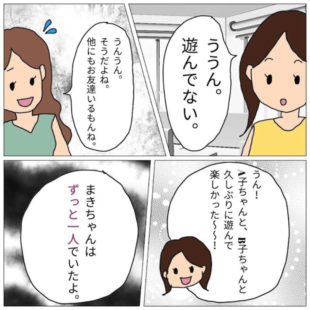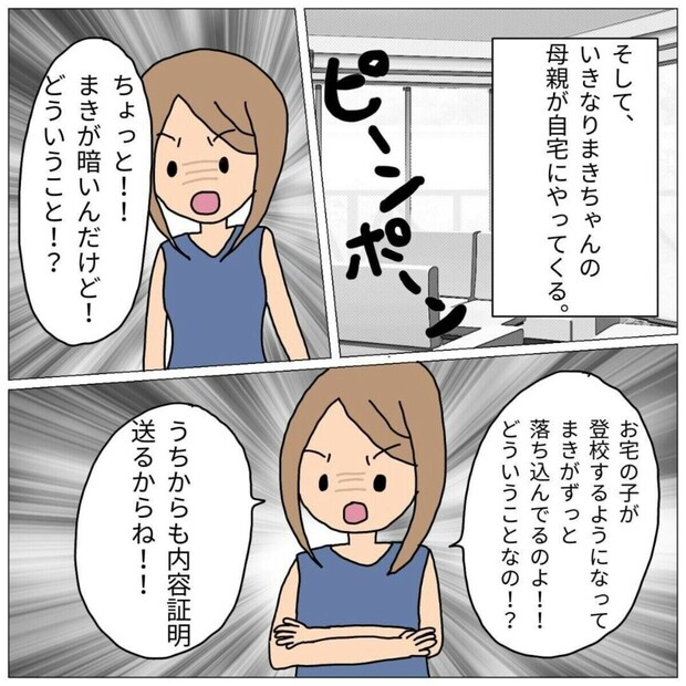 謝罪どころか、クラスで孤立し始めたまきちゃんを見たまきちゃんのママは、「内容証明を送る」と被害者のようにフォロワーさん宅へと押しかけてきたのです。そしてまきちゃんのママも孤立していったのでした。