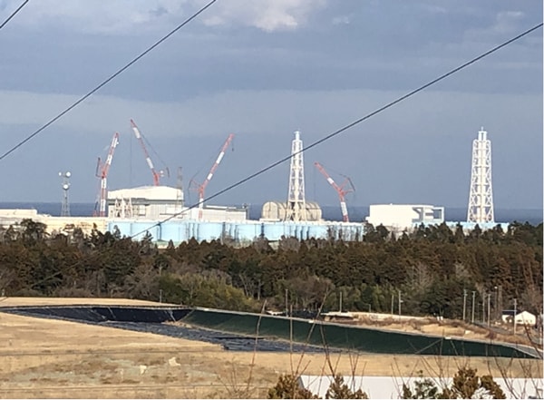 福島県・大熊町の中間貯蔵施設の小高い場所から見た東京電力福島第一原子力発電所