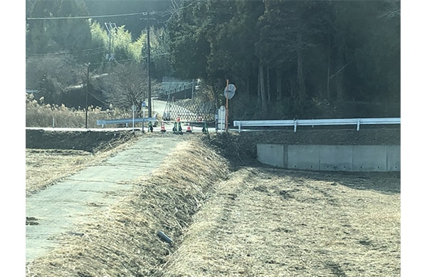 大熊町をバスで移動中の車窓から。バリケードの向こう側は2045年まで立ち入ることのできない「帰還困難区域」。数百メートルごとに、住めるようになった場所とそうではない場所がパッチワークのように点在します