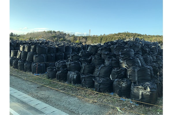 見学した大熊町の中間貯蔵施設の敷地内に積まれた汚染土の入ったフレコンバッグ
