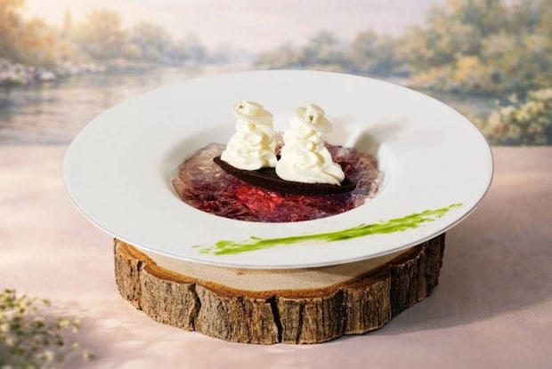 メインプレート「舟遊びのジュレ」では、≪舟遊び≫が宿す水面のきらめき、春の風、光の揺らぎなどを立体的に表現。ラズベリーとマスカットのジュレを重ね、あかすぐりの実のきゅっとした酸味がアクセントに。カカオ香るタルトショコラの上には、2人の女性を象ったマスカルポーネの絞りが添えられ、見た目もアートな仕上がり。小舟の情景を映し込み、移ろう波の色彩などを繊細に描き出している。