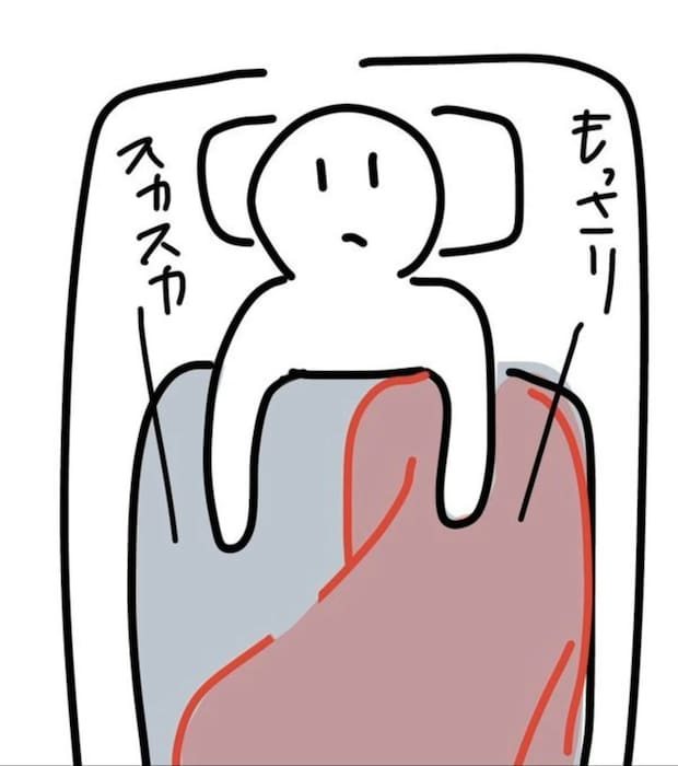 掛け布団カバーの中で掛け布団がズレてしまい、片方はもっさり、もう片方はスカスカ……。この状況、まさに「直すのめんどい」ですよね!シンプルなイラストも相まって、その“絶妙なめんどくささ”が伝わってきます。