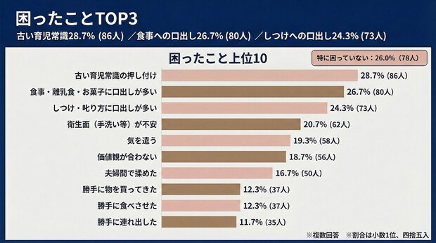 なお、「特に困っていない」と回答した人も26.0%(78人)と一定数存在しており、祖父母との関係が良好な家庭も少なくないことがわかります。