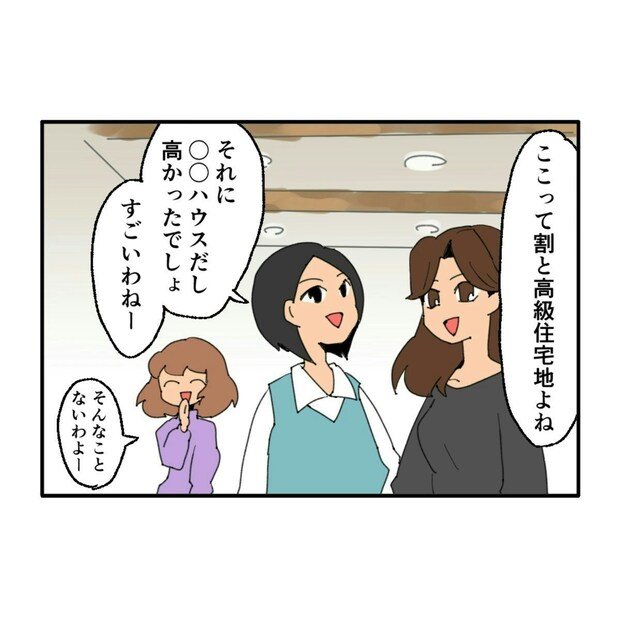 一方、見栄っ張りなハルミさんですがご近所との関係は良好なようで、お隣りの高見さんから自宅でのお茶会に誘われました。そこで同じ年の子どもを育てるママさんたちと出会い、良い友人になれそうだとホッとするのでした。せっかく良い家を建て、すてきな人たちを知り合えたのですから、ハルミさんがこのママさんたちと等身大の良い関係を気づけると良いですよね。
