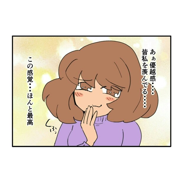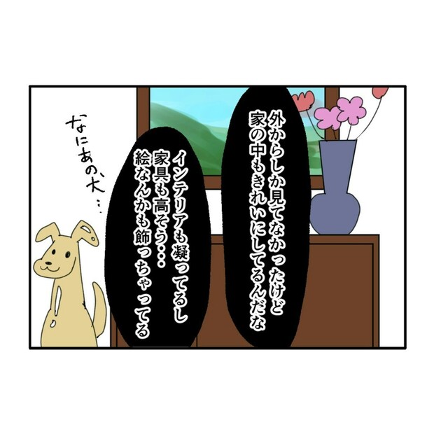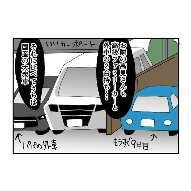 友人たちの羨望のまなざしに快感を得ていたハルミさん。友人たちが述べる「いいなあ」という感想の中に、ハルミさんは自分がまだ気づいていなかった視点を見つけます。それは車。近所の車を見ているとそれらの車種は自分たちの車よりどれもグレードが高いものに見えました。ハルミさんはそのことに少し焦りを感じているようです。