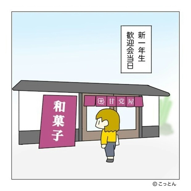 主人公・山吹さんは、新1年生歓迎会で配る紅白まんじゅうを受け取りに、和菓子屋さんを訪れます。