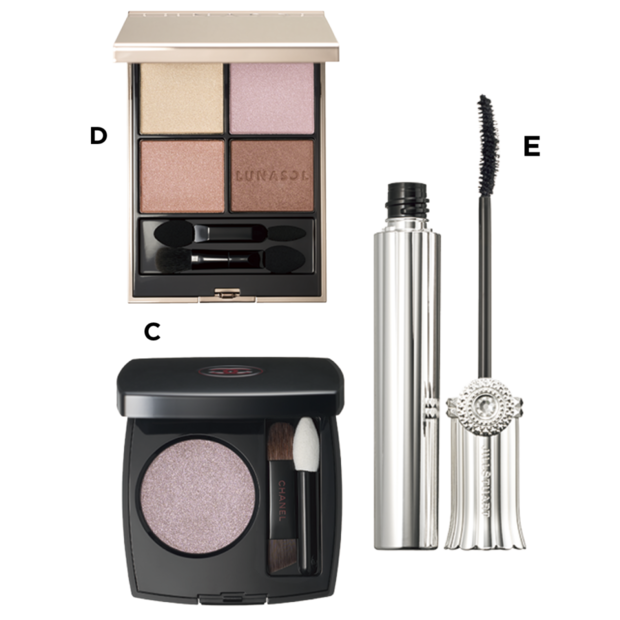 C オンブル エサンシエル 257 ¥6,600(シャネル) D ルナソル アイカラーレーションN 19 ¥7,700(カネボウ化粧品) E ジルスチュアート ブルーミングラッシュ ニュアンスカーラー 19 ¥3,300(ジルスチュアート ビューティ)