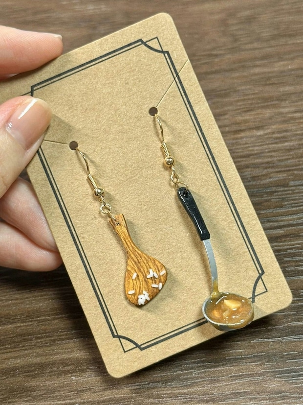 お玉についた具の感じや、カレールウがトロッとしている感じを、リアルに表現しています。しゃもじに付いた白ご飯が、より一層食欲を引き立てますね。カレーのミニチュアピアス、欲しくなりました!