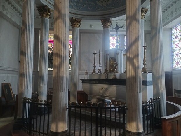 ステンドグラスから差し込む柔らかい光が射し、ガラス戸の内側のこのスペースは厳かな空気で満たされている、と感じられます。