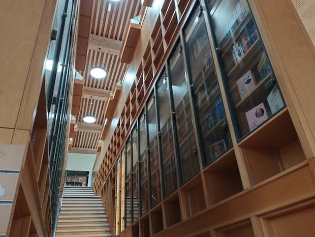入り口にある受付カウンターの横の通路を入ると、中央に美しく細く伸びる木の階段、階段の左右に整然と並ぶ本棚の木の縦横のライン、そして吹き抜けの高い天井に配置された木枠のコントラストにしばし見とれることになります。