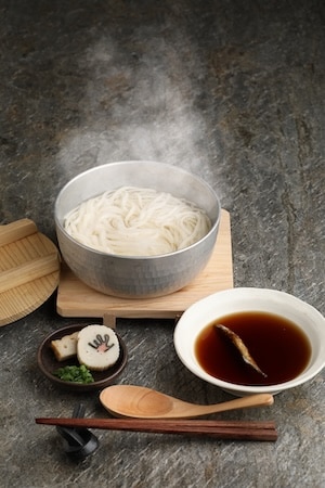 1000年以上の歴史を持つ名産品、五島手延べうどん。「五島うどん」880円は、細身でコシが強く、滑らかさと喉ごしの良さを持ち合わせた五島のうどんを、釜揚げ風に五島のきびなごとあごだしのつけ汁で用意している。
