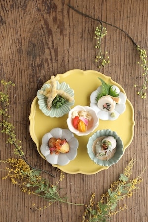 今がおいしい旬の食材を取りそろえた「あえんの春野菜と五島の旬まず一品 五種盛り合わせ」1,280円では、五島のかんぼこ わさび塩/湘南ポモロンとオレンジのピクルス/ホワイトセロリときのこの肉巻き蒸し 胡麻だれ/新じゃが芋とベーコン 桜エビのマヨネーズ/きびなごの一夜干し天ぷらを用意。素材を活かすシンプルな調理方法で提供する。