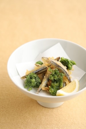 「きびなごの一夜干しとあおさの天ぷら」680円は、五島列島でよく食べられる魚の一つであるきびなごを、一夜干しにして旨みを凝縮させてから天ぷらにした一品。あおさ海苔の天ぷらと盛り合わせることで、豊かな香りと鮮やかな色合いも楽しめる。