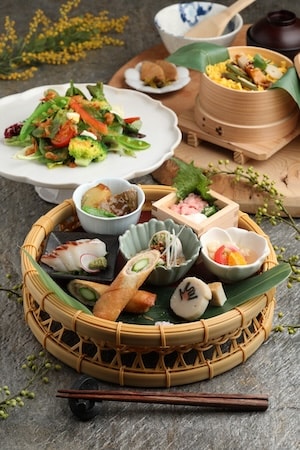 豪華な「春の竹籠ごちそう膳」3,300円には、季節のすり流しや、桜エビとクリームチーズ、人参ドレッシングで味わう春野菜の彩りサラダに加え、メバルの麹揚げ 柚子胡椒あんかけ/五島のかんぼこ/お造り/たたきマグロの海苔巻き/アスパラと桜山豚の春巻き 桜塩など、季節のごちそうを竹籠盛りに。山菜と鶏のわっぱめし、お漬物、麦味噌汁と共に、春の味覚を心ゆくまで満喫できる内容となっている。
