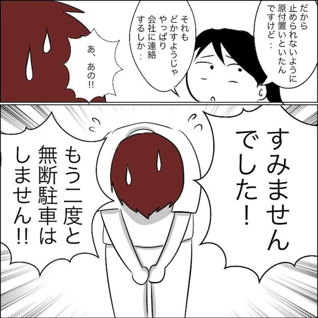無断駐車をしているのは、同じ団地に住む住民宅に訪れているマッサージ業者と判明。Aiさんは無断駐車をやめさせるべく直談判しますがなかなか納得してもらえません。そこで、夫と協力して管理会社に問い合わせるなど対処したAiさん。無断駐車をした本人からは無事に謝罪を得ました。