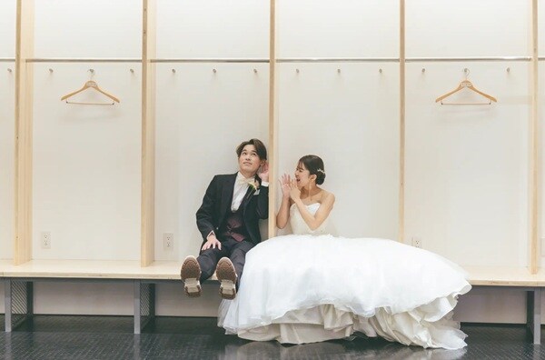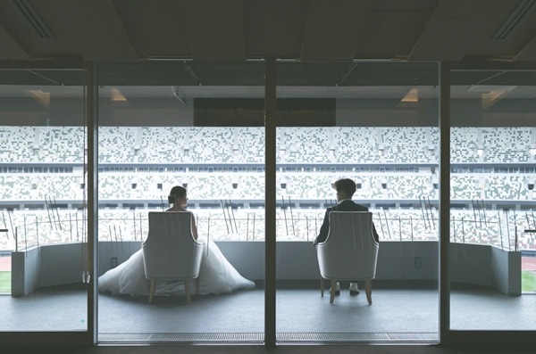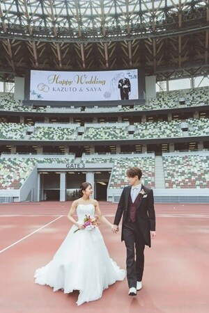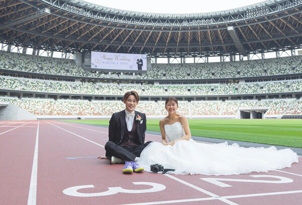新婦の紗耶さんは「貴賓室が特に印象に残っています。普段は入ることのできない場所で撮影できたことは、とても貴重な経験でした。二人で椅子に座り競技場を見下ろしているバックショットは、コントラストが美しく、とても印象的でした。また、トラックでの撮影も印象深く、世界で活躍する陸上選手たちが走った場所に自分も立っていることが不思議で、特別な感動がありました」と喜びを語ったという。