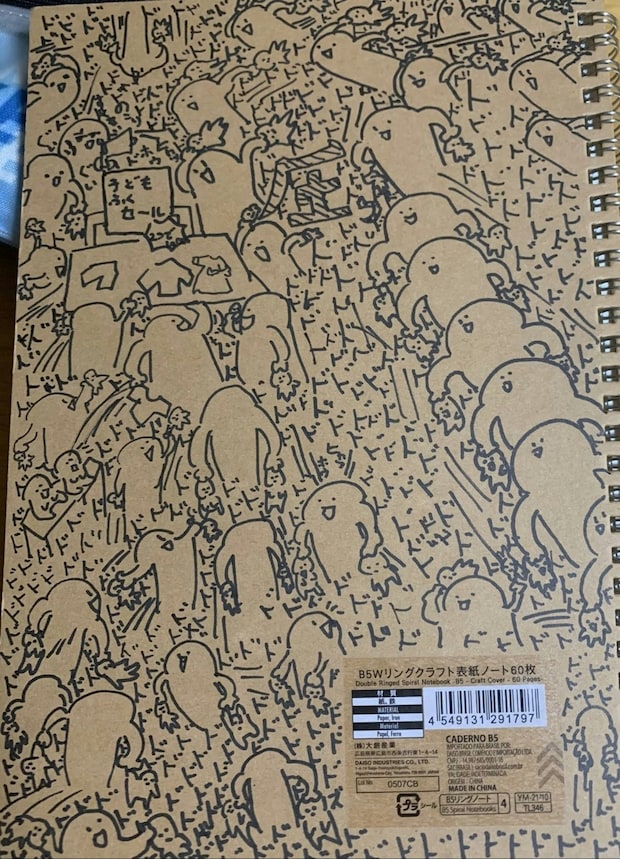 ノートの表紙にびっしりと描かれたイラスト。なんと下書きもせずに一発で描いたものだと言うから驚きですよね。「こどもふくセール」と書かれた場所に突進していくキャラクターや、両手にぬいぐるみのような物を持っているキャラクターなど、かなり細かく描かれています。「ドドドド」という効果音が聞こえてきそうなぐらい躍動感にあふれています。