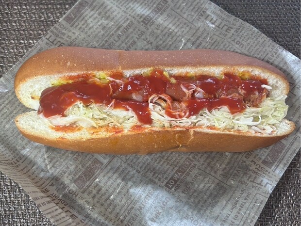 安い惣菜パンにありがちなふにゃふにゃの生地ではなく、バリっとした食感のパンにソーセージがまるごと1本サンドされています。