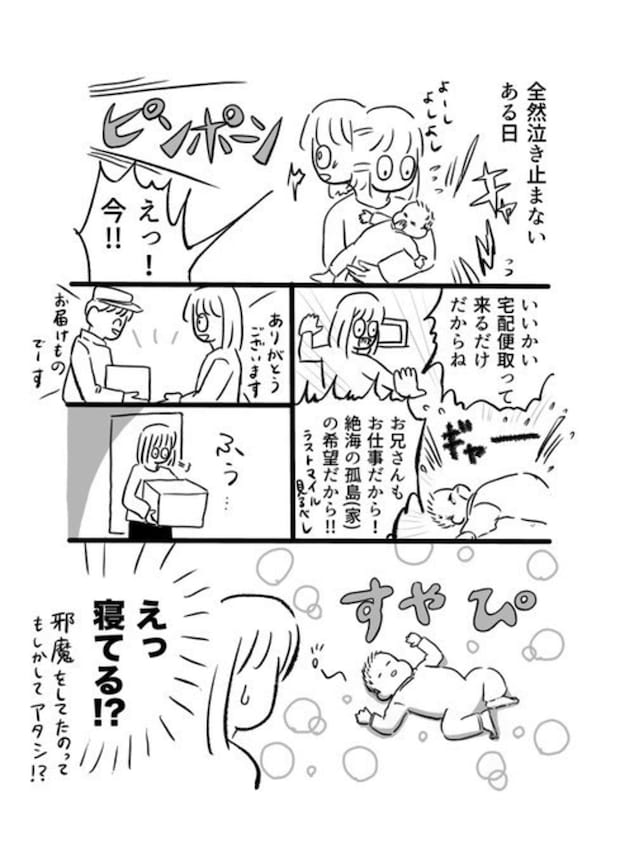 投稿者・タカ子@育児漫画_初マタ→4m(@takako_ninshin)さんの、当時4か月だったお子さんはある日、全然泣き止まなかったそう。寝かしつけようと試みる中、宅配が来て…。