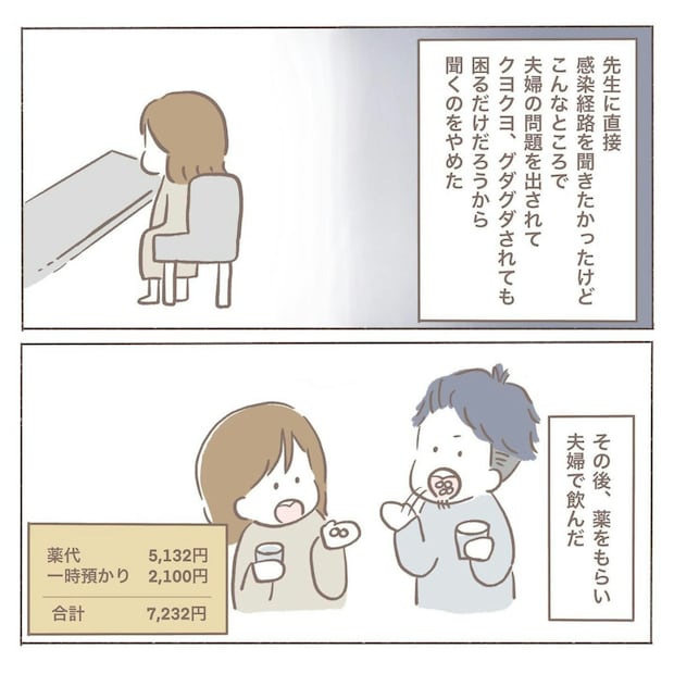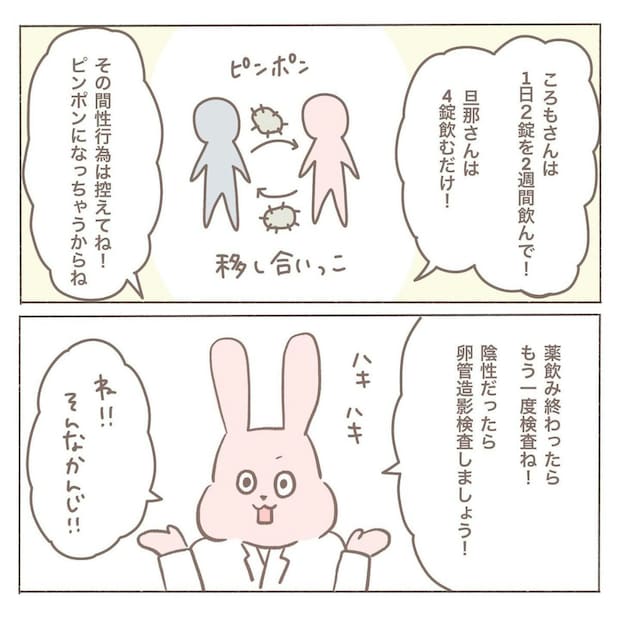 深刻に考えていたcoromoさんでしたが、先生は淡々と説明し、夫の検査もいらないと言います。薬をのんで陰性がでたら次のステップに進めるようです。