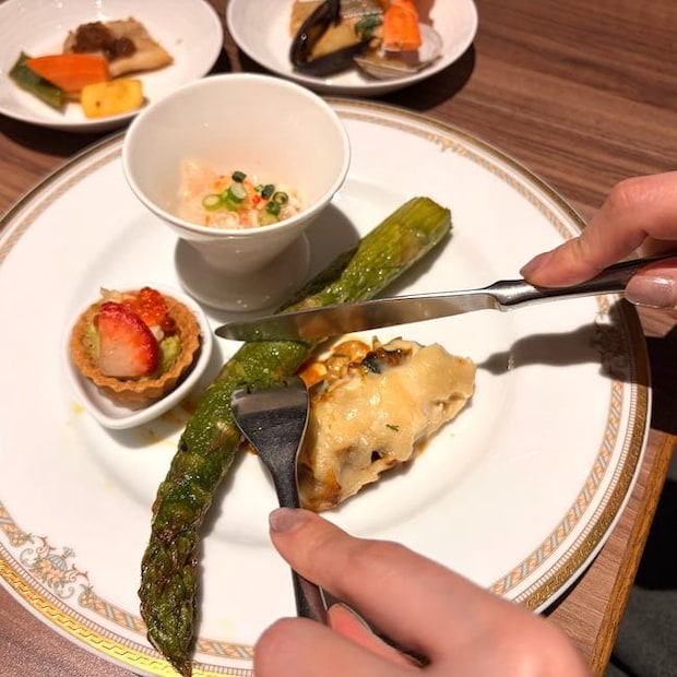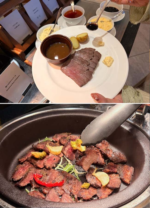 ビュッフェの定番といえばローストビーフ。こちらでは、好きなだけ目の前で切ってくれるシェフサービスで提供しています。「何枚でも好きなだけ切りますよ!」と笑顔で話してくれるシェフが印象的で、編集部もたっぷりいただきました。ひと口いただくと、柔らかく、噛み締めるほどにうまみが広がり口福に。王道のグレイビーソースやレフォール(ホースラディッシュ)、トリュフソルト、タルタルソースなどのコンディメントで食べ比べれば、いくらでも食べられそう。