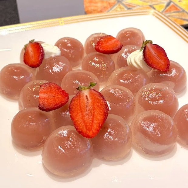 スイーツは約10種が揃っており、今回は旬のいちごを使ったものが多く並んでいました。なかでも目を引いたのが、いちごがトッピングされた「玉水晶」です。透明感のある葛の生地で餡を包んだ和菓子で、透けて見える薄ピンクのいちご餡が涼しげでかわいらしい。もっちもちの生地といちごの風味が効いた餡の組み合わせが、どこか懐かしいほっこりする味わいでした。