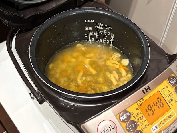 袋の中には具材とダシが入っているので、といだお米に混ぜ合わせて炊飯していきます。