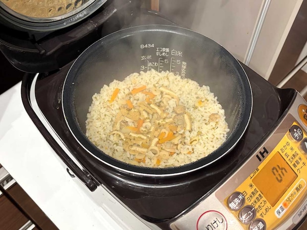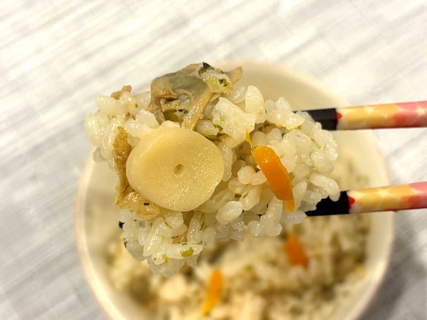 炊き上がりを見てみると、オレンジ色のにんじんや丸くカットされたたけのこ、はまぐり、油揚げがごはんの中にたっぷり入っていました!見た目の彩りもなかなか豊かです!
