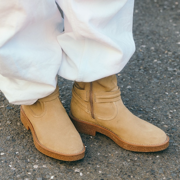 ベージュスエードシューズは、ホワイトボトムスとの相性抜群! まだ肌寒い日も、明るめカラーで季節を先取り♪
