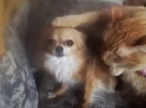 隣にいる猫さんが、犬さんの頭に手を置いて