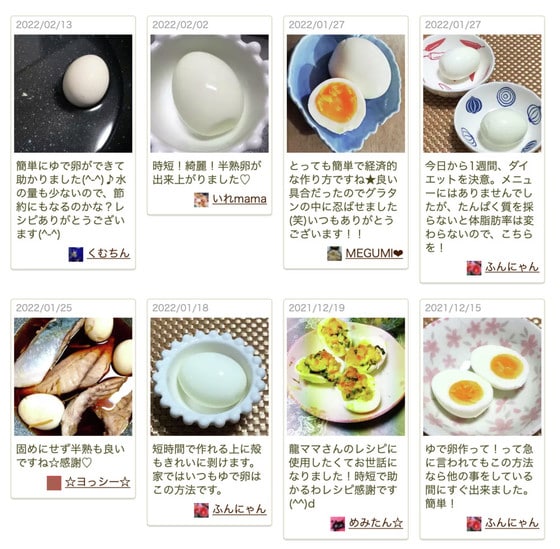 つくれぽ(作りましたフォトレポートのこと)にも「短時間で作れて、殻もきれいに剥けます。」「簡単にゆで卵が作れて助かりました!」「見た目にも美味しそうなゆで卵が簡単に作れる!」など嬉しい声がたくさん届いています。