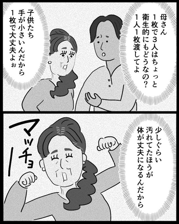 「母さん、1枚で3人はちょっと衛生的にもどうなの?1人1枚渡してよ」紘一さんの言葉に、「子どもたち手が小さいんだから1枚で大丈夫よぉ。少しぐらい汚れてたほうが体が丈夫になるんだから」とマッチョポーズで答える義母。